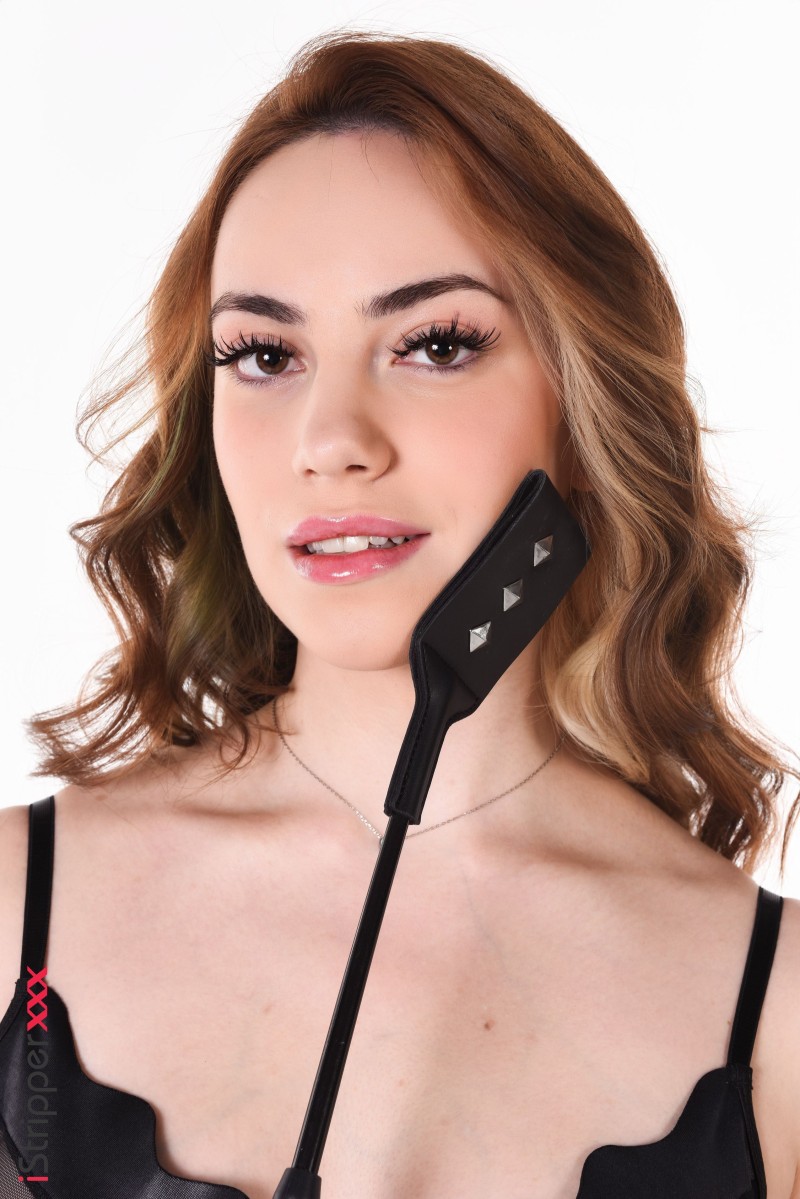 I am so excited to tell you that "Buttocks Spanking" stars Abby Margarita, who is wearing thigh high leather boots, lingerie, and is holding a spanking paddle. She is turning towards the camera, smiling, and looks like she is ready for some fun and excitement.