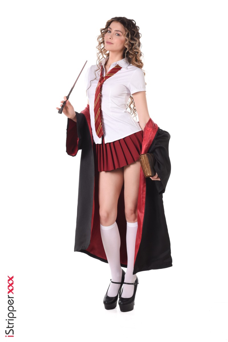 In "Erotic Spell", Alissa Foxy is dressed in a magical school uniform with a tie, short skirt, and robe, holding a wand and a book, ready to cast a spell of seduction. The scene is set for a playful and enchanting striptease where she will gradually reveal more as she works her seductive magic!