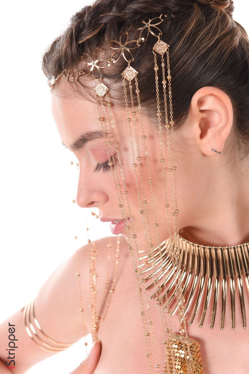 The "Gilded Evening" scene features the sexy and beautiful Alissa Foxy in a gold chainmail dress that is both elegant and revealing with sexy, golden arm bands and jewelry. She tantalizingly displays her body for the viewer while showing off her beautiful legs.