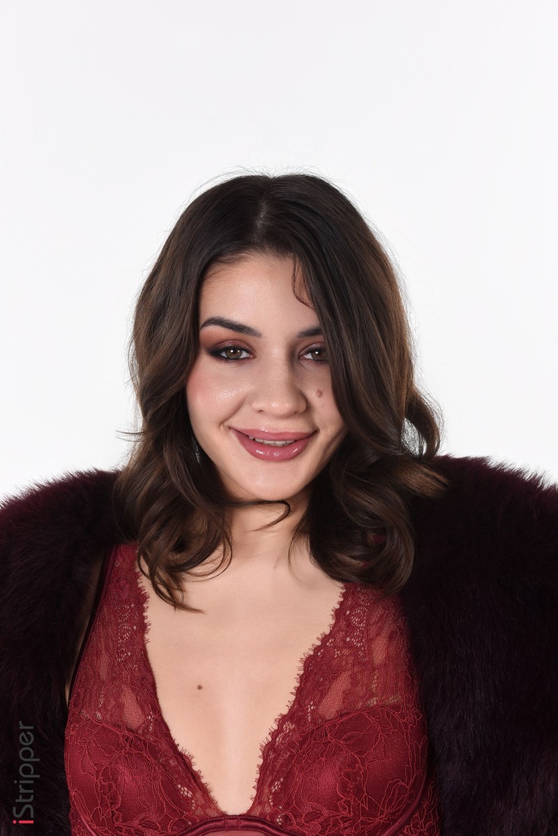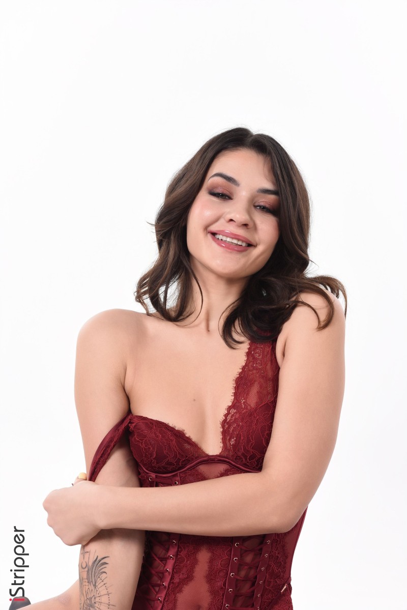 Esteria begins the "Luxurious Seducing" striptease with a captivating smile, teasingly revealing her elegant red lace lingerie beneath a rich, dark fur coat. Her inviting gaze and confident posture promise an exhilarating performance as she prepares to shed her opulent layers.