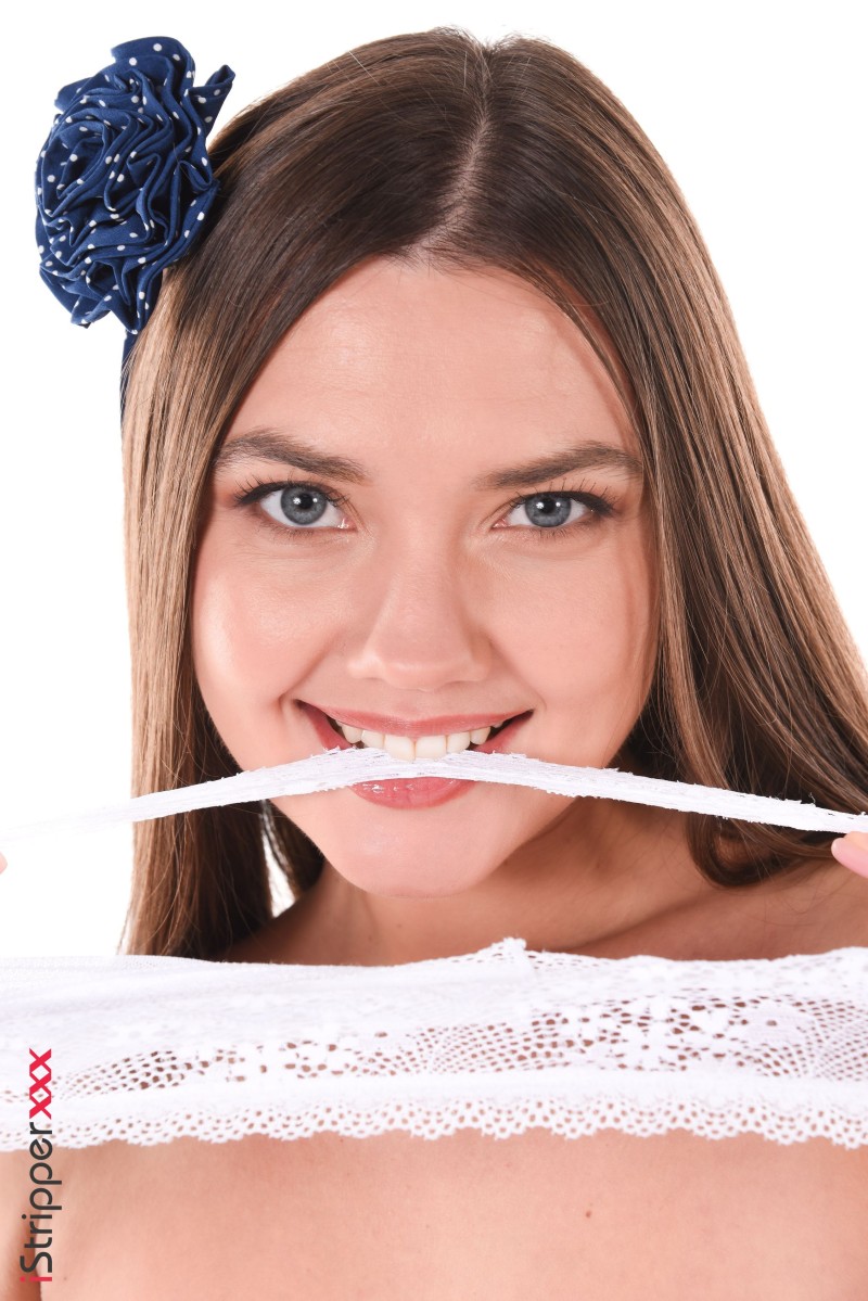 I'm so excited to describe these pictures to you; Get ready! The "Strapless Vibes" scene starts with the stunning Georgia, she is wearing a short, strapless blue dress with white polka dots and her long brown hair cascading down her back. In the scene, she has white wedge heels and looks at the camera with a seductive smile, hinting at the tantalizing striptease that is about to unfold.