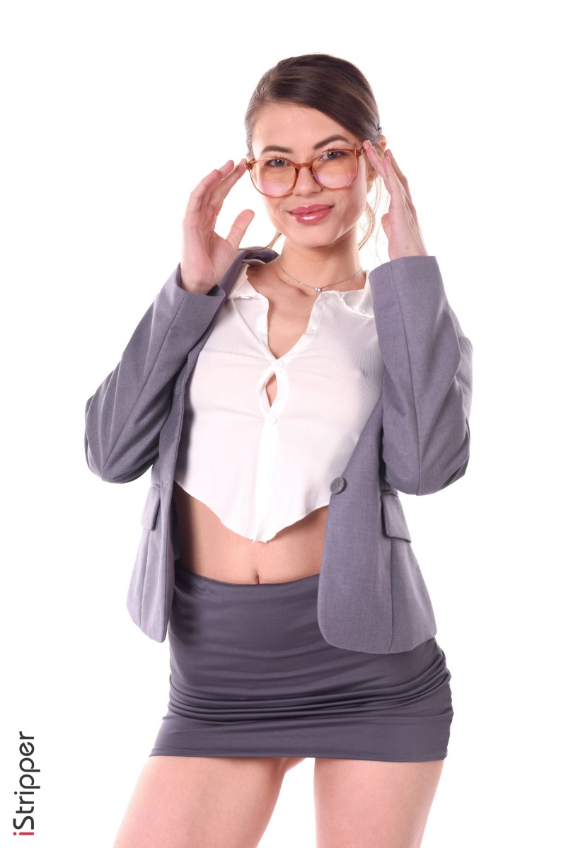 I am very excited to describe this scene for you! In "It's Business Time" the stripper Hilary C is stripping off her office clothes in a sexy manner, starting with a gray suit and ending up in lingerie. The woman is slowly teasing us by removing her blazer, blouse, skirt and glasses.