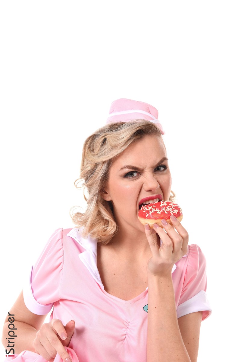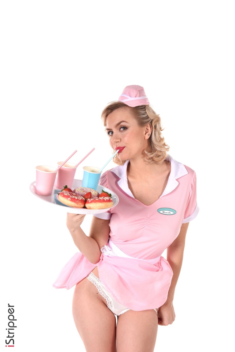The striptease scene "Serving Up Happy Endings" presents Lana Lane dressed as a roller skate waitress in a pink uniform, playfully teasing with a tray of goodies and treats that she is about to serve you. She's got a sweet smile and a cheeky attitude, ready to turn up the heat and get you going in this enticing performance.
