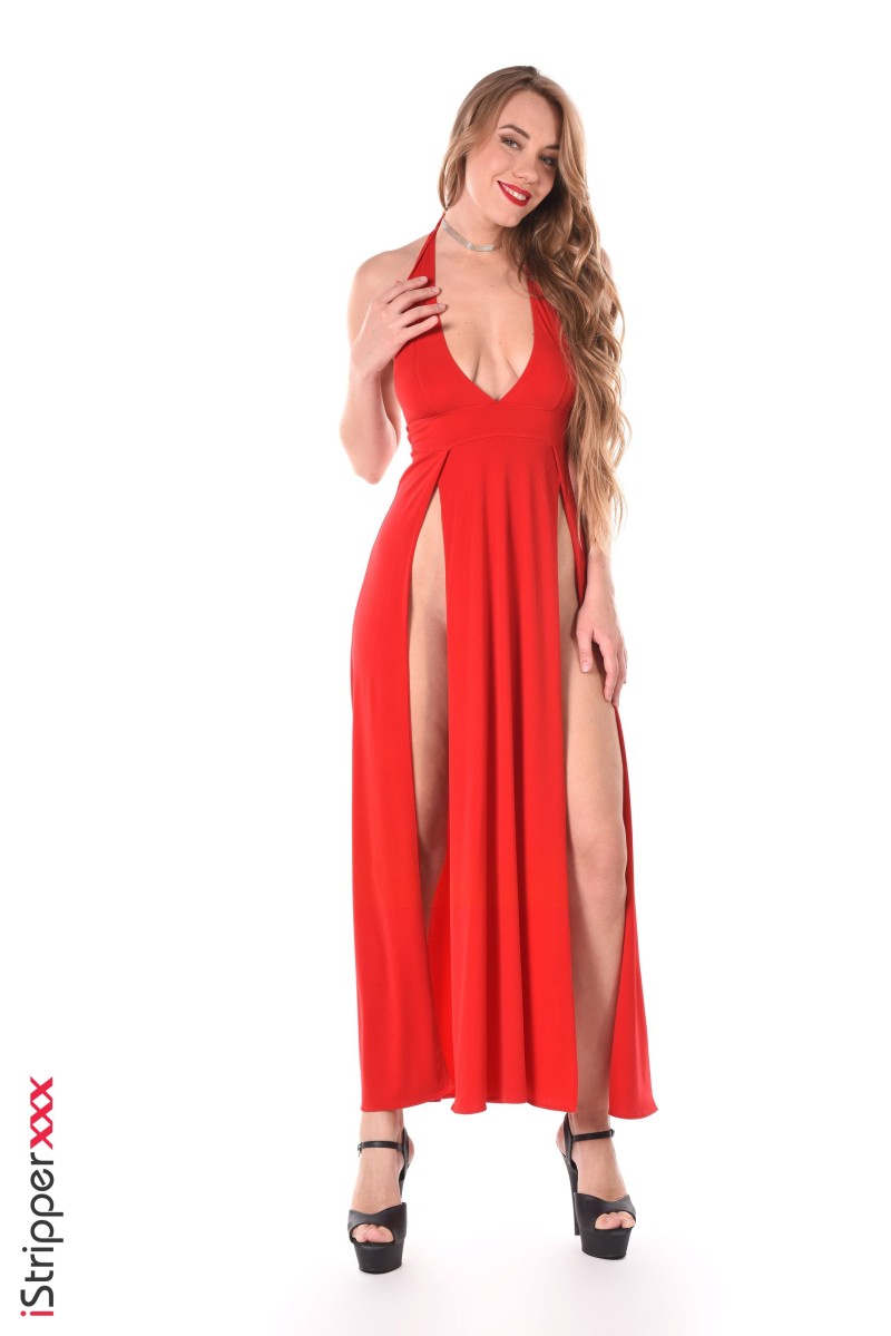Ryana is in "Beauté Sulfureuse" wearing a long red dress with thigh high splits and very high heels, she is smiling, as she is preparing to strip for the camera. The lighting is bright and the stripper looks ready to give a very sexy show, what is not to love about a sensual striptease?