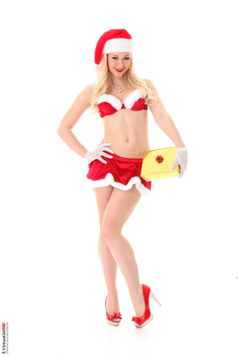Get ready for a very exciting Christmas gift with the gorgeous Tracy Lindsay! In this scene, Tracy starts by wearing a sexy Santa outfit. I mean, a very short red skirt, a matching bra with some white fluff, red high heels, white gloves and a cute Christmas hat. Oh my, she looks absolutely stunning! She is also holding a nicely wrapped yellow gift box and seems excited to share her Christmas spirit with us. The blonde bombshell poses and teases us with her incredible body, she looks directly at us with a very inviting smile, her red lipstick highlighting her full lips. As the scene progresses, Tracy sits on a bright red chair that perfectly matches her outfit. Her beautiful long, blonde hair cascades around her shoulders as she continues to seduce us with her playful glances. The excitement builds as Tracy gently touches her face and body, drawing our attention to every curve. It's like she's unwrapping herself as a special Christmas gift just for us, she slowly and sensually removes her skirt bit by bit. And boy, is it a sight to behold!